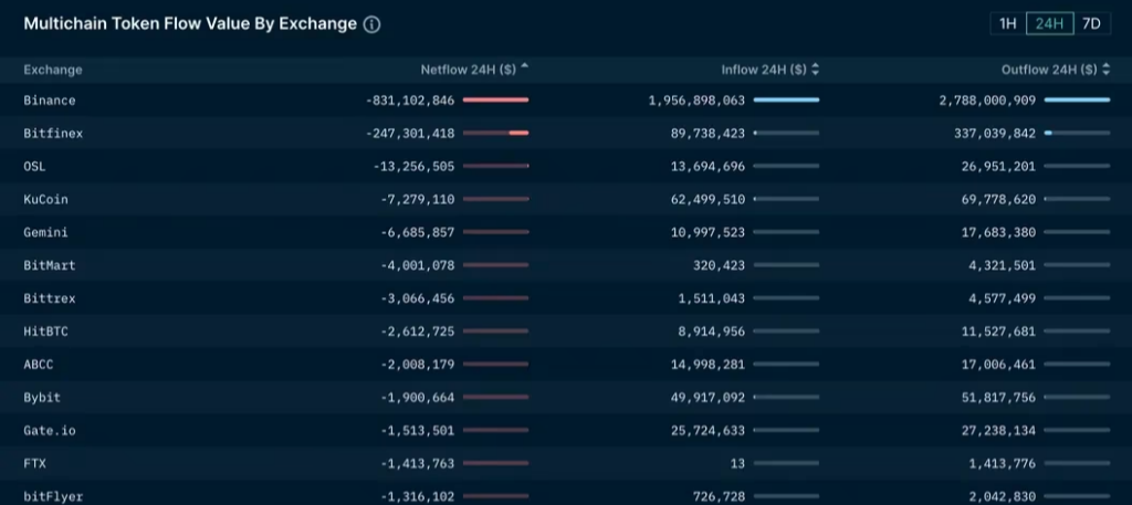 오늘 14일 코인데스크에서 난센 데이터를 인용해 세계 최대규모인 암호화폐 거래소 바이낸스에서 지난 24시간 동안 무려 약 8억 3100만 달러가 순유출돼어서 2022년 11월 이후 최대 일일 순유출량을 기록했다고 합니다.